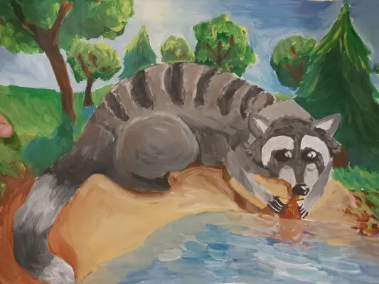 Евгений нарисовал енота, которого выгуливали в парке Кусково. Очень неожиданная встреча, ранее мальчик видел енотов только в зоопарке или на картинках.