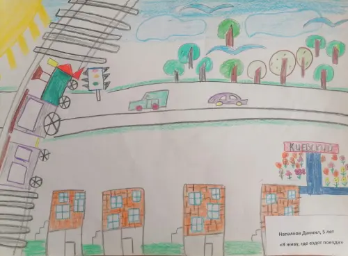 Даня любит рисовать. Мы живем в поселке, рядом с железной дорогой. Папа Дани — машинист. Он часто рассказывает ему и его старшему брату Илье о поездах. Также Даня любит машины, поэтому выбор пал на рисунок с железной и автомобильной дорогой.