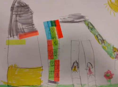 Я люблю высокие и быстрые горки. На данном рисунке изображена высокая горка, высокие качели и гигантская песочница. Я бы хотел, чтобы во многих дворах моего района были высокие горки. Кататься с них очень весело!