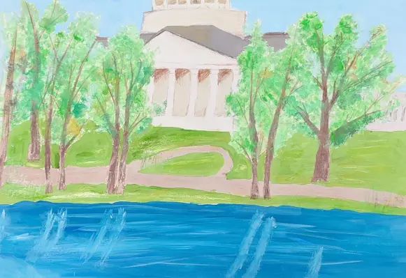 На своём рисунке я изобразила Государственный музей-заповедник усадьба " Остафьево " — " Русский Парнас ". Усадьба Остафьево расположена в Подольском районе, рядом с пос. Щербинка. Первое упоминание об Остафьево относится к 1340 г. Своё нынешнее название Подмосковная получила во второй половине XVIII в. после присоединения её к соседней деревне Остафьево.