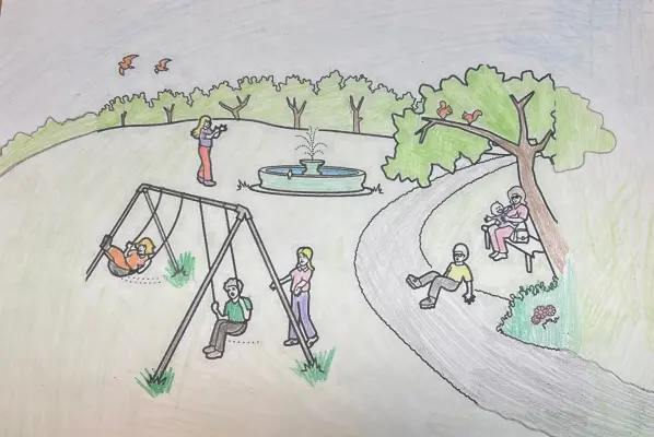 Я очень люблю летом ходить в сквер, там очень красивый фонтанчик с прохладной водичкой. А мама сидит на лавочке с моей младшей сестрой под деревом в тенечке.