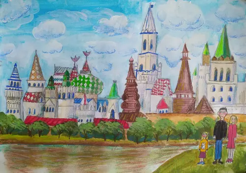 На рисунке изображен пруд возле Измайловского кремля. Мы с мамой и папой любим там гулять. Летом по нему можно покататься на лодке и с воды посмотреть на Кремль. Мне очень нравятся яркие, расписные терема и палаты. А ещё белокаменный дворец и храм.