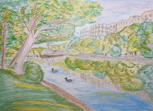 Люблю гулять по бульварному кольцу. Кто бы мог подумать, что когда-то на месте бульварного кольца находилась стена Белого города, когда же ее снесли, то на этом месте было решено разбить прогулочные зоны. Так что, бульварное кольцо — это одно из самых интересных мест в центре Москвы. А еще они являются частью зеленых легких города. Каждый бульвар – это история и в каждом есть что-то свое, интересное и необычное. Где-то это пруд, как на моей работе, где-то памятники или цветники. Идея этой работы была навеяна мечтательной летней прогулкой и мне захотелось поделиться радостью и теплом с теми, кто будет на нее смотреть. Здесь на пруду часто можно увидеть семейство уток и тех, кто их кормит, вечером он подсвечен волшебными цветными фонариками, а днем солнечным светом. Это удивительное место, где отдыхают жители города и где даже ловят рыбу. А еще на бульваре проходят всякие интересные мероприятия: фестивали, ярмарки, выступают музыканты, есть цветники и продают мороженое.