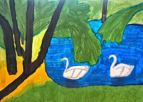 Работа выполнена на листе формата А3 гуашью. На рисунке изображен кусочек реки Яузы Лосиноостровского района и ее прекрасные жители — лебеди. Мне очень нравится это место.