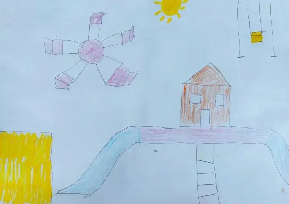 У меня во дворе детская площадка. Там есть домик с двумя горками, туда можно забраться по лесенке-чудесенке и скатиться с горки. Есть веселая карусель, качели и песочница