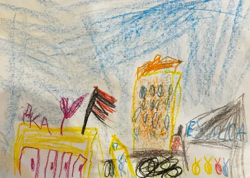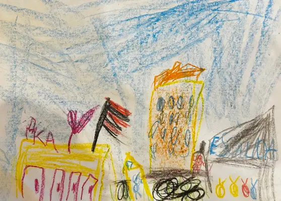 На рисунке изображен мой район, ДК Коммунарка, куда я хожу на уроки рисования, также мой дом со множеством окошек, фитнес Эскалада, который я часто посещаю, кафе Шаурма и газопровод, и улица Липовый парк.