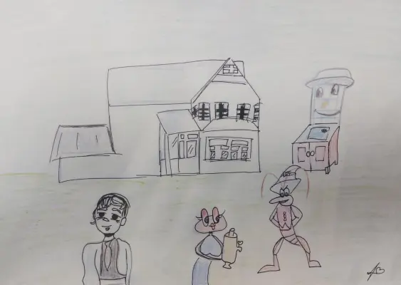 Моя дочь Мария очень любит гулять во дворе. Мария нарисовала рисунок, как она видит двор своими глазами. Хотелось бы, чтобы во дворе было побольше персонажей.Моя дочь Мария очень любит гулять во дворе. Мария нарисовала рисунок, как она видит двор своими глазами. Хотелось бы, чтобы во дворе было побольше персонажей.