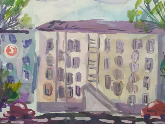 На картине я нарисовала свой дом на ул. Авиамоторной, мне нравятся наши дома, здесь уютно и очень красиво, много зелени во дворах. Я люблю свой район.