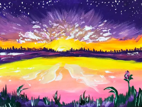 Берег большого озера, закат. Жёлтый горящий диск солнца уже коснулся верхушек деревьев на другом берегу. Слева деревья чуть ближе и чуть выше и кажется, что солнце зацепилось краем за их ветви. Сами же деревья уже почти не различимы – они стоят чёрной изгородью над озером, а над ними – безоблачное, жёлто-оранжевое закатное небо, цвет которого чем выше, тем бледнее, с постепенным переходом к уже обозначившейся ночной синеве…