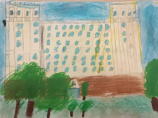 Я вдохновляюсь своим офисом и решил перенести его на холст бумаги, когда я увидел офис, я был восторге и понял, что я попал в рай, так как здание было очень красивое.
