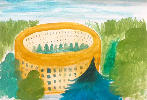 Первый круглый дом был построен в предверии олимпиады в 1972 г.Первый круглый дом был построен в предверии олимпиады в 1972 г. О его форме ходили легенды, кто то в народе называл его дом- бублик, кто то дои-колизейПервый круглый дом был построен в предверии олимпиады в 1972 г. О его форме ходили легенды, кто то в народе называл его дом- бублик, кто то дои-колизей