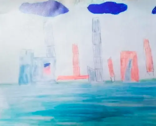 Гуляли с мамой и сестрой рядом с высокими стеклянными высотными зданиями, уходящими в самое небо. Меня это очень впечатлило, и я сразу по возвращению домой нарисовала Москву-Сити. Прогулка мне очень понравилась.