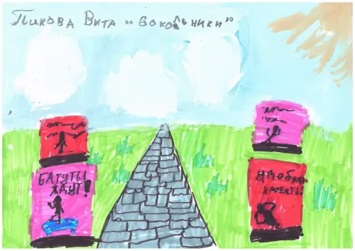 На рисунке изображен район «Сокольники». Центральная часть рисунка занята серой мощеной дорожкой, уходящей вдаль. По обеим сторонам дорожки находятся красочные рекламные плакаты. На левом плакате изображен человек на батуте, с надписью «Батуты ждут!». Вокруг простирается зелёная трава, а на фоне голубого неба видны белые облака. Рисунок передает атмосферу яркого и живого района, где сочетаются активный отдых и домашний уют.