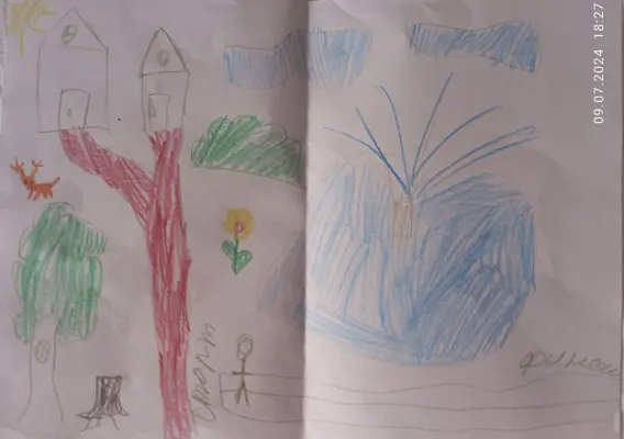 Работа выполнена цветными карандашами. Ребенок нарисовал парк «Дубки», расположенный в Тимирязевском районе. Там очень красиво и зелено. Есть игровые площадки, спортивные площадки, каток, пруд и церковь Святого Николая.
