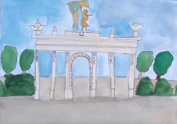Мне нравится рисовать акварелью. Я выбрала для рисунка главный вход ВДНХ, потому что это любимое место для прогулок нашей семьи! По выходным мы часто едем туда и наслаждаемся окружающей красотой.