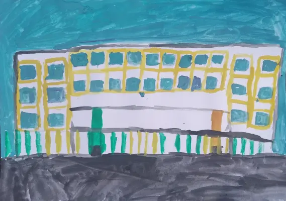 Моя школа очень большая и у нее много окон. В школе учится много детей, поэтому в школе три этажа. Вокруг есть веселый забор, он покрашен в желтый и зеленый цвета.