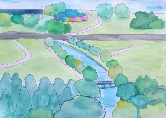 Я люблю рисовать акварелью и фломастерами. Я изобразила парк, куда мы ходим гулять с дедушкой. Там много травы и больших деревьев, под которыми можно прятаться от солнца. Еще в парке есть река, в которой плавают утки. Они очень смешные, когда пытаются поймать еду, которую мы им кидаем, когда стоим на мосту.