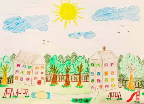 Я нарисовала свою улицу. Щербинка это самый лучший район Москвы. На моей улице самые высокие дома. Во дворе есть много детских уголков, где я с друзьями весело гуляю