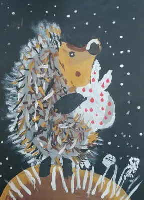 Наше излюбленное место досуга — парк «Сосенки». Приходя в него мы всегда наблюдаем за живой природой. Однажды с дочкой, мы увидели в низине у речки маленького ежа. Дочка сразу вспомнила любимый мультфильм «Ежик в тумане» и нарисовала картину о любимом герое в нашем парке.