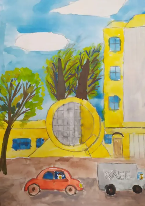 Сюжет моей работы подсказала моя будущая школа. Скоро я иду в первый класс и моя школа находится напротив этого здания. Она похоже на фару машины, это необычная архитектура, построенная в 30-х годах 20 столетия. Как мне рассказала мама это был гараж Госплана, последнее здание, построенное архитектором Мельниковым в стиле Конструктивизма. Я люблю свой район Дангауэровка.Сюжет моей работы подсказала моя будущая школа. Скоро я иду в первый класс и моя школа находится напротив этого здания. Она похоже на фару машины, это необычная архитектура, построенная в 30-х годах 20 столетия. Как мне рассказала мама это был гараж Госплана, последнее здание, построенное архитектором Мельниковым в стиле Конструктивизма. Я люблю свой район Дангауэровка.