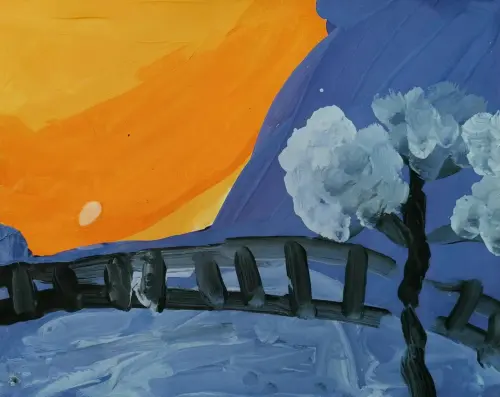 Парк «Сосенки» особенно красив, когда наступает вечер. Здесь можно увидеть красивый закат, когда солнце уходит за горизонт. Мы часто в парке гуляем с любимой бабулей. На картине нарисован спуск по лестнице в долину реки Котловка.