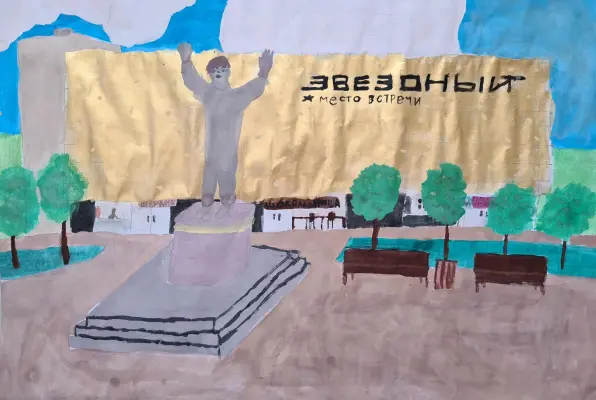 В этой работе я изобразила одну из достопримечательностей района Проспект Вернадского — кинотеатр Звёздный и памятник первому человеку в космосе Юрию Гагарину.