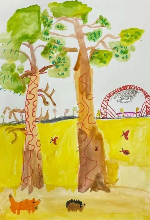 На рисунке изображено любимое место Даши для прогулок — набережная с парком и Живописный мост. Стадион Октябрь — прекрасный уголок отдыха, отличное место для прогулок.
