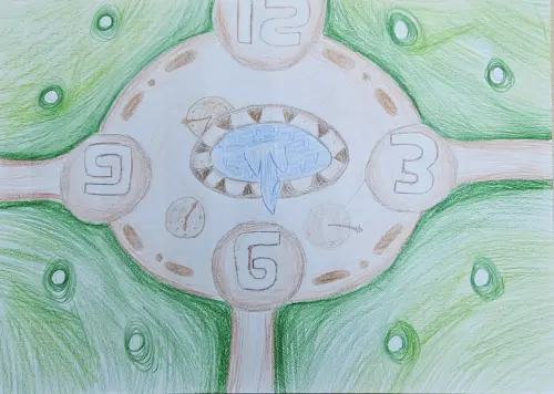 Сегодня нам с ребятами предложили нарисовать одно из мест нашего прекрасного города. Я вспомнила, что из моего окна видно часы с фонтаном. Мне очень нравится.
