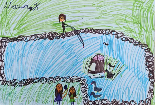 Сегодня нам с ребятами предложили нарисовать одно из мест нашего прекрасного города. Я люблю гулять около пруда, где живут уточки с утятами и лебедями.