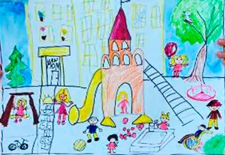 Маша нарисовала свой любимый двор. Летом, каждый вечер, друзья собираются вместе, чтобы поиграть, потанцевать и чудесно провести время. Кто-то рисует на асфальте мелом, играет в мяч, в прятки, лепит куличики в песочнице.