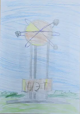 Сегодня мы с ребятами делали рисунки своих дворов и районов. Я живу в первом микрорайоне, но часто гуляю в дендропарке и оттуда видно красивую стеллу.