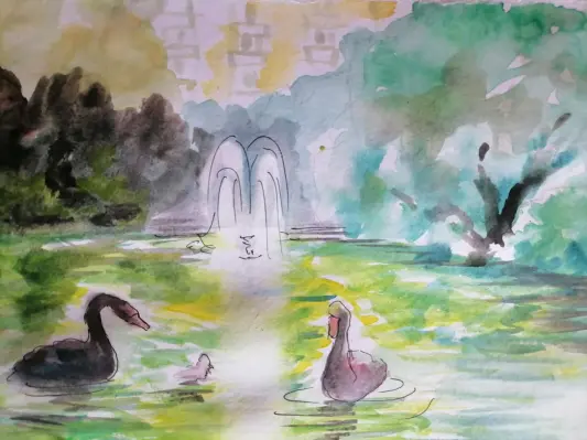 Сегодня мы с ребятами делали рисунки своих дворов и районов. Я решила изобразить свой любимый пруд. Он любимый, потому что там живут лебеди и утки с утятами.
