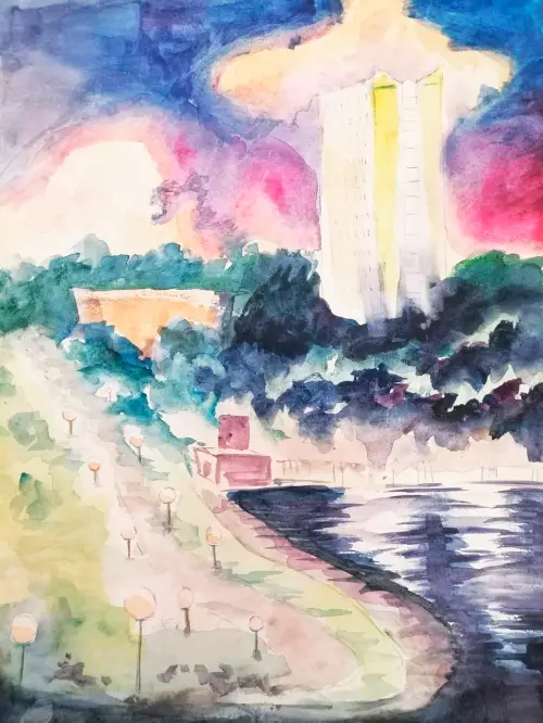 Сегодня нам с ребятами предложили нарисовать одно из мест нашего прекрасного города. Я вспомнила, как гуляла с родителями и мы пошли в парк Победы. Мне там очень понравилось.