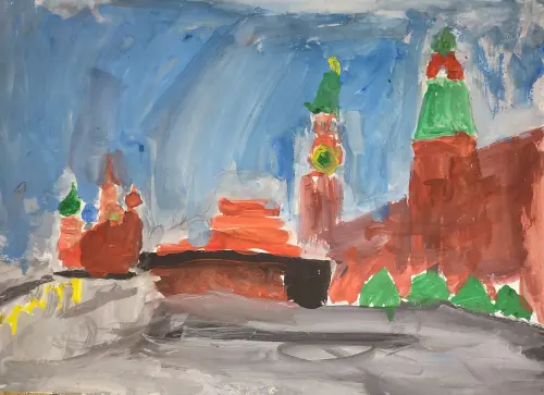 Картина, нарисованная девочкой пяти лет, представляет собой изображение Московского Кремля с использованием гуаши. На картине изображены Мавзолей Ленина, Спасская и Сенатская башни, а также Храм Василия Блаженного.