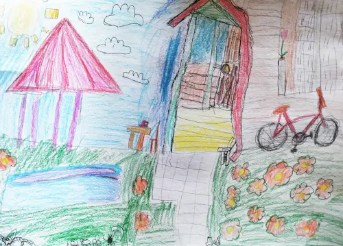 Мой любимый дворик. Техника выполнения карандаш.Мой любимый дворик. Дом, площадка. Я очень люблю цветы, поэтому много цветочков. У нас в районе следят за красотой. Высаживают цветы в клумбах. На удобном красном стуле мама может посидеть и выпить кофе. Техника выполнения карандаш.