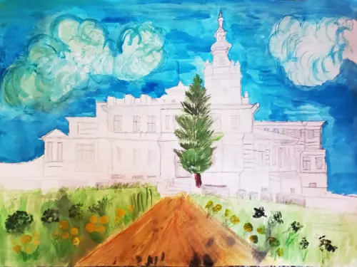 Саму усадьбу мне помог нарисовать дедушка, очень хотелось передать ее красоту в рисунке. Усадьба обнесена забором, но рядом с ней есть Грачевский парк. Там можно погулять, среди липовых аллей.