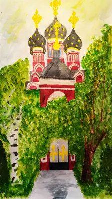 Пятиглавый храм построен в стиле русского узорочья и украшен настенными фресками.