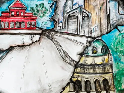 Моя работа символизирует прогресс в архитектуре начиная с семнадцатого века. Прогресс, который продолжается до сих пор и будет продолжаться. На данной картине изображены такие объекты как: Дом Критского — " Памятник деревянного зодчества" девятнадцатого века; Московский международный деловой центр «Москва-Сити» (ММДЦ); «Церковь Рождества Святой Богородицы» в Подмоклово. Старинная архитектура прекрасна, но движение вперёд неотъемлемая часть любой культуры.