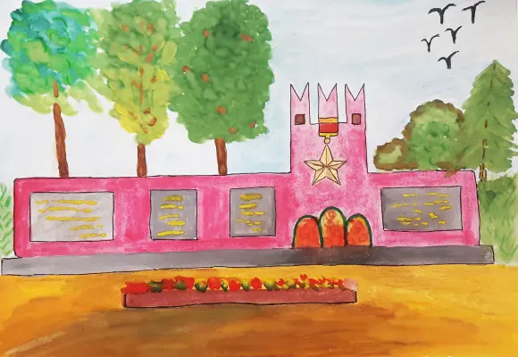 Работу помогала выполнять сестрёнка Кристина (9 лет) На рисунке изображён Памятник «Героям-Панфиловцам», который установлен на одноимённой улице района Северное Тушино в 1966 году, в честь воинов 316-й стрелковой дивизии под руководством И.В. Панфилова, прославившейся во время обороны Москвы.