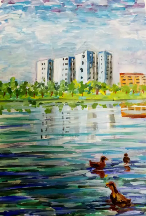 Здравствуйте.Вашему вниманию представляю мою картину «Вид из окна моей комнаты».Я живу на 9 этаже окно моей детской комнаты, выходит на пруд.Как же он великолепен.Там живут мои маленькие друзья, а почему друзья, как мы переехали в Прима Парк, рядом с прудом, я познакомилась с уточками и по сей день дружу сними. Они стали совсем ручные.Я, со своими друзьями забочусь о них круглый год. А также мне нравиться моя новая школа и парк.В моих воспоминаниях навсегда останется, что к нам на открытие школы приезжал сам мэр г.Москва и я поймала с его рук мяч ).Спасибо.