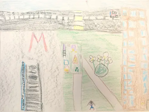 Настя живет в большом городе, и часто вместе с мамой ездит на метро. У метро есть сквер, где можно покататься на качелях и отдохнуть на скамейке, напоминающей колесо.