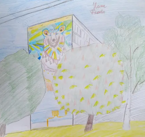 Весной сделали фотографию дома с ярким и красочным медведем, цветущими каштанами и зелёными деревьями. Решили повторить этот вид в работе. Весной сделали фотографию дома с ярким и красочным медведем, цветущими каштанами и зелёными деревьями. Решили повторить этот вид в рисунке. Граффити с медведем -изюминка района.