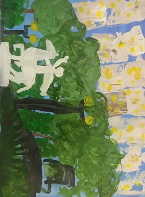 Ян живет в районе Коньково, поэтому символом района является Конь. Ян нарисовал белого коня на фоне высоких домов, зеленых деревьев, сочной травы, ярких фонарей и скамейки.