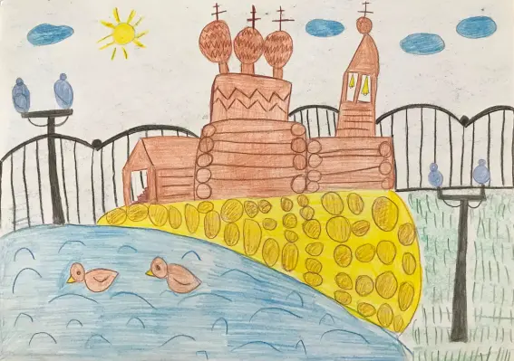 В самом центре нашего поселения находится пруд. В нем живут уточки, огари и прилетают чайки. Вокруг пруда есть дорожки и фонари. В водах пруда отражается красивая церковь, которая стоит на берегу пруда. Церковь, как из древней Руси, сделана из дерева. Она вся резная. Здесь хорошо гулять и отдыхать.