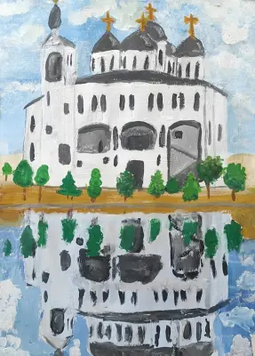Работа в технике гуашь. Храм Преподобного Сергия Радонежского на Ходынском поле — утраченный православный храм в Москве, находившийся при летних военных лагерях на Ходынском поле. Построен в 1892—1893 годах на средства благотворителей, действовал в летнее время. Деревянный храм выдержан в неорусском стиле, автор проекта — архитектор Иван Хородинов. После Октябрьской революции храм был закрыт и к 1930-м годам снесён.