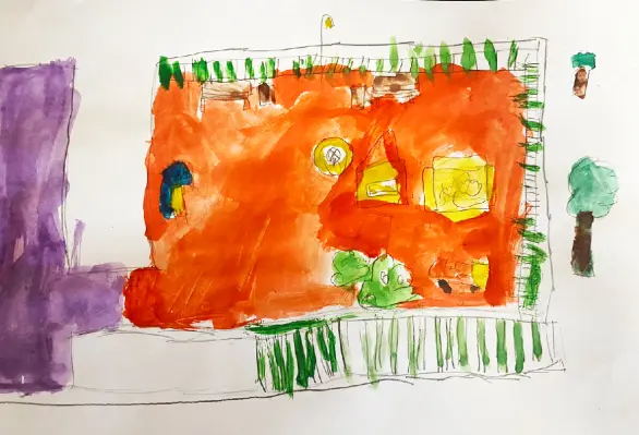 Работа выполнена гуашью. Я нарисовал свой садик. Мне очень нравится этот сад, у нас красивые площадки, качели, горки, песочницы, беседки у каждой группы.