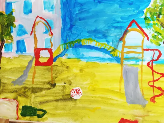 Это наша любимая площадка в нашем дворе. Очень любим здесь играть, кататься с горки, лепить куличики, пускать мыльные пузыри. А зимой лепим снеговика.
