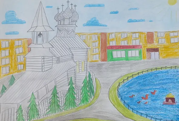 Я – Доронин Артём. Живу в Новой Москве, поселение Киевский. В своём рисунке я хочу показать свой любимый район. Это пруд с уточками и храм «Неупиваемая чаша», который привлекает своей архитектурой. У меня самый красивый район.