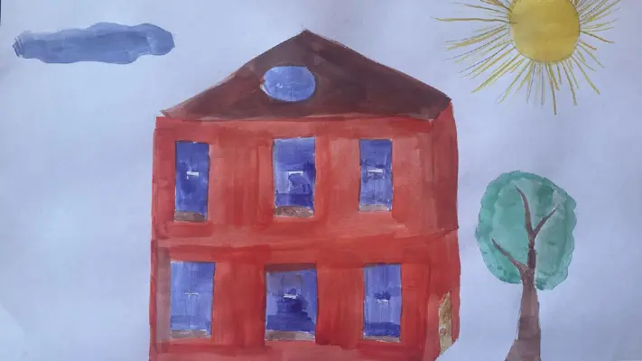 Работа выполнена гуашью. Я нарисовала наш дом в районе Хорошёвский. У нас дом очень красивый, со своей архитектурой, красивыми окнами, во дворе детская площадка.