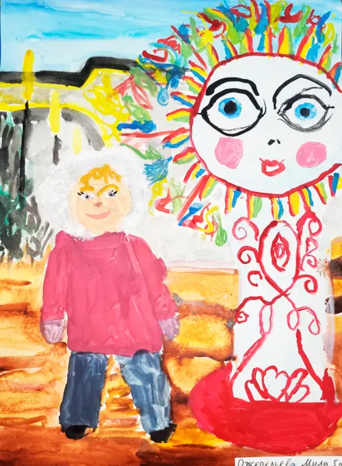 Мила очень любит посещать городские праздники в своем районе Вешняки. Этой весной она сходила с мамой на Масленицу и весело провела там время. По памяти она попыталась нарисовать то что на там видела и где гуляла. Городская площадка Мои сезоны в Вешняках и фигура Масленницы, которая ей очень понравилась. На рисунке Мила стоит рядом с ней и улыбается.